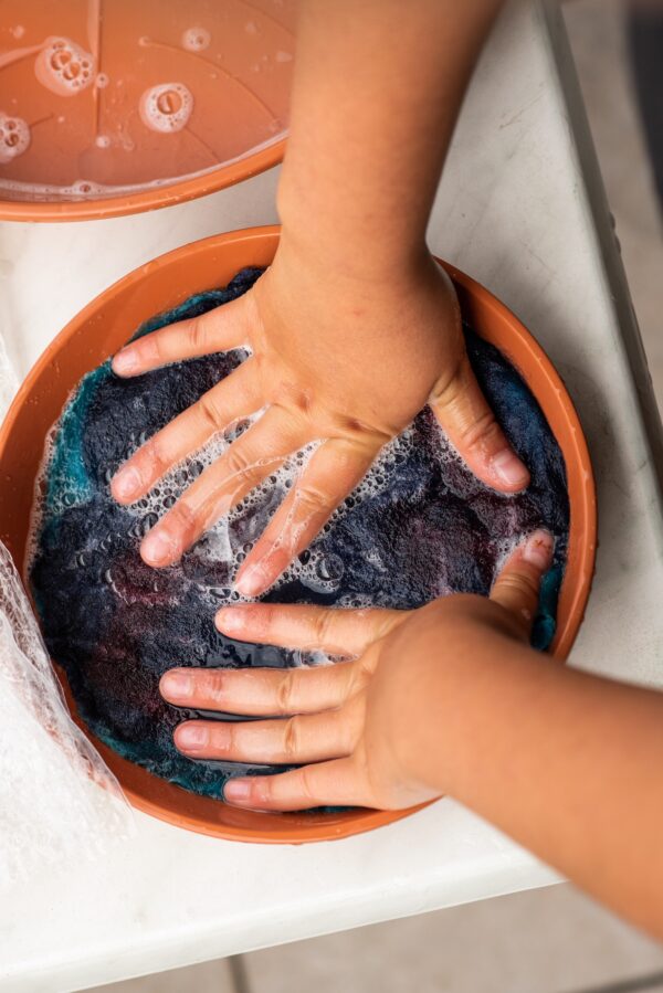 Schafwolle + Seife + heißes Wasser + Hände = Filz